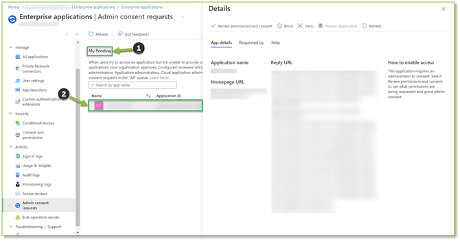 - Navigate to the Admin Consent Request – Azure Active Directory portal, locate and select the My Pending tab. A list of all applications that have been submitted by end users requiring additional privileges will be listed. Selecting any of the listed applications will allow you to view additional details about the application itself, who initiated the request, and will allow you to perform actions on whether to allow end users to be able to access this application or not.