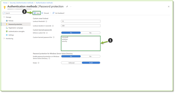 - Navigate to the Password Protection – Azure Active Directory portal, locate and select the Custom banned password list textbox, here you will be able to configure words that will be flagged and prevented for end users to configure during the password creation or password renewal process. Once the desired words that management has deemed easily guessable have been added select Save to finalize the addition.