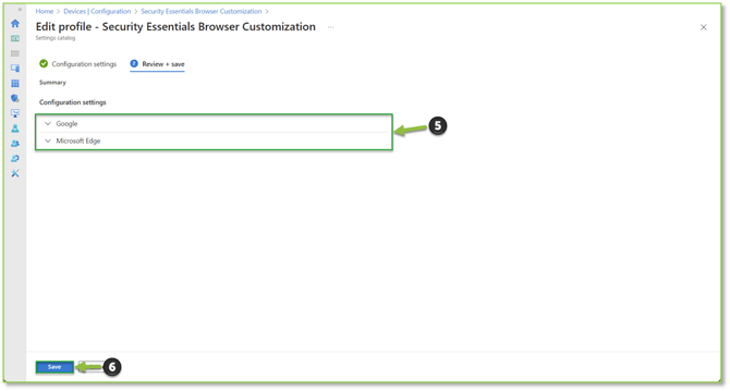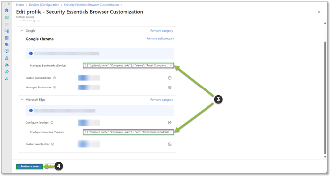- When removing a desired bookmark from either one of the desired browsers, begin by selecting the dropdown beside either the Google or Microsoft Edge blade. Under the Google blade we will be looking for the configuration setting Managed Bookmarks (Device), for Microsoft Edge we will be looking for Configure Favorites (Device). Selecting the text field next to the setting will allow you to remove the desired bookmark by selecting the desired {“name”/”url”} or {“url”/”name”} entry and deleting the entry from the field. Make sure that you also remove the comma (,) located at the end of the previous entry to prevent syntax errors. Select Review + Save to proceed to the review section.