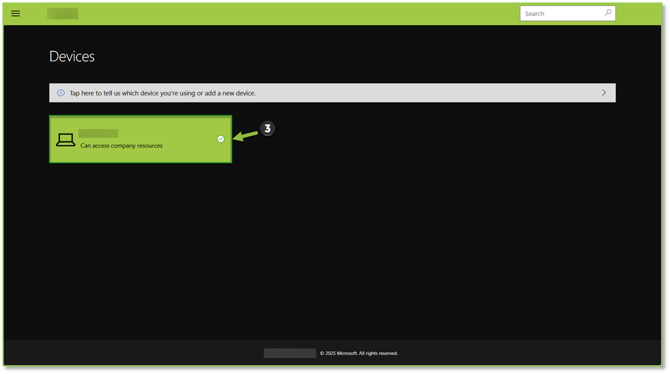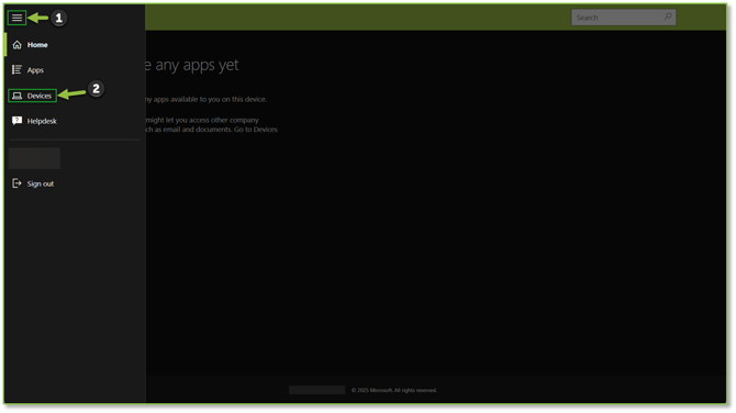 - Navigate to the Company Portal site, when opened you will see the Home section. We will want to select the three lines at the top right of the screen to expand the menu. From the pop-out we will want to locate and select the Devices tab to view the list of Intune joined devices that have been registered using our Microsoft credentials.