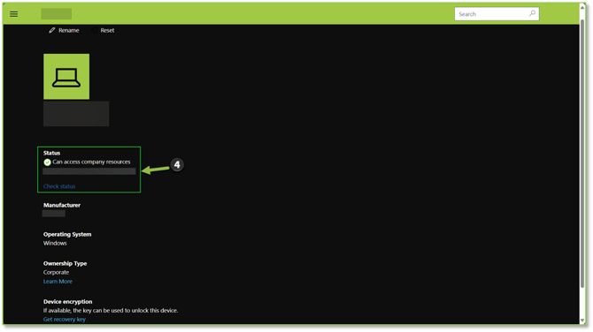 - Once inside the device entry, we will want to focus our attention on the Status section, here we will be able to determine if our device is passing or failing compliance and security policy enforcements which determines if we have access to resources tied to this device.