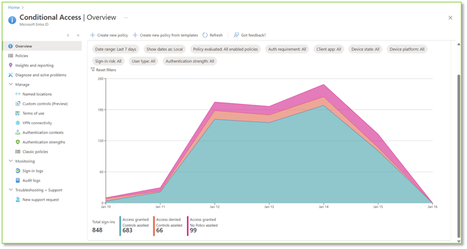 - Navigate to the Conditional Access Overview – Azure Active Directory portal, we will want to locate and select the Monitoring (preview) tab. Here you will find information about recent authentication access that was enforced on user sign-ins. The available information will be detailed as, Access Granted Controls Applied (Conditional Access Policies granted access while enforcing controls such as requiring MFA when accessing specified resources like Office 365.), Access Denied Controls Applied (Conditional Access Policies issued a block due to failure to meet the required access controls such as not verifying MFA.), Access Granted No Policies Applied (Conditional Access Policies were not applied when accessing the target resource, and access was granted without restrictions.) Filtering can be adjusted if you know specific information related to the event you are trying to explore.