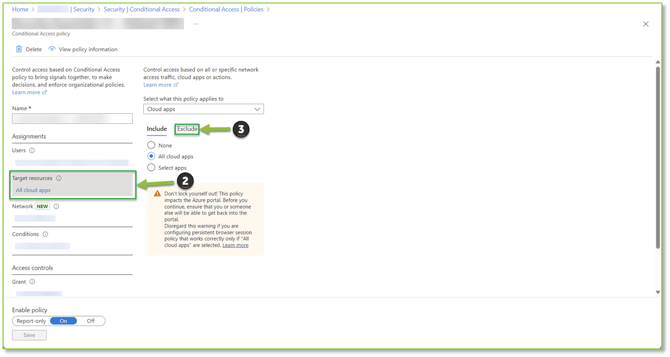- Select the hyperlink under the Target Resources section. The applicable included cloud applications in scope will be shown. Select the Exclude header to begin the exclusion process.