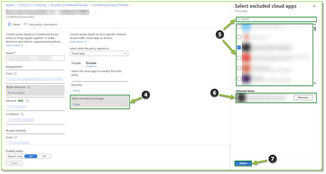 - Under the Exclude subsection, locate, and select the Select Excluded Cloud Apps hyperlink, a pop-out will be displayed where you will be able to select the app(s) which should be excluded from the policy, selections can be made either by traversing the list manually or utilizing the search bar. Selected app(s) will be generated in the list below the catalog. Click Select once the desired app(s) have been supplied.