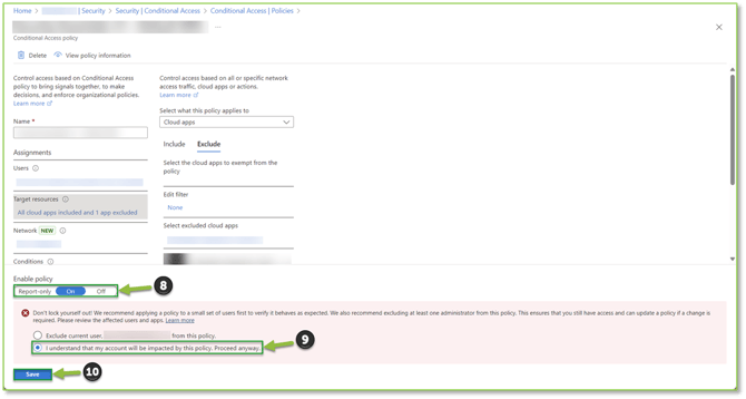- After the Select action has been carried out, a pop-up will be generated under the Enable policy section. Here will want to verify that the Policy remains On, and that the I understand that my account will be impacted by this policy Proceed anyway option is selected from the prompt, failure to do so could result in an unsanctioned user account bypass which could increase risk if misconfigured. Click Save to finalize the application exception process.