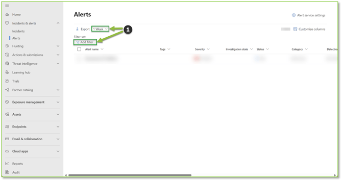 - Navigate to the Alerts – Microsoft Defender portal, here you will see a list of alerts that were flagged in your network. If you are looking for a specific event based on a classification such as a date, severity, categories, service sources, etc. you can utilize the provided filters as desired to return the results you need to investigate.
