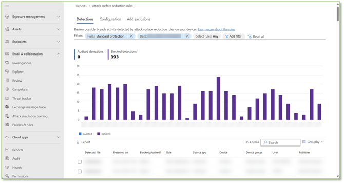 - Navigate to the Attack Surface Reduction Rules – Microsoft Defender portal, this page provides information about the attack surface reduction rules that are being applied to Intune joined devices. This report also provides information about detected threats, blocked threats, and detected devices that aren't configured to use the standard protection rules to block threats.