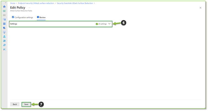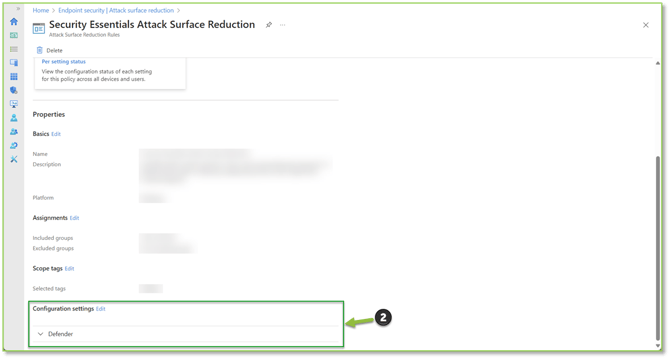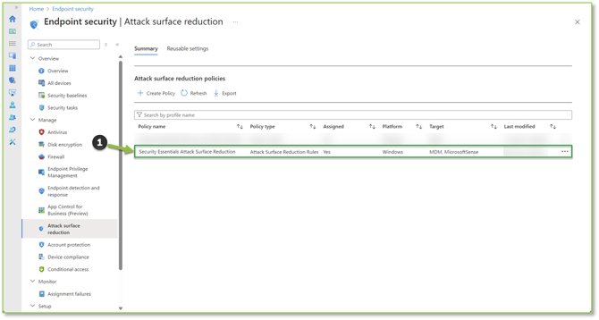 - Navigate to the Attack Surface Reduction – Intune portal, locate and select the Security Essentials Attack Surface Reduction policy or an equivalent ASR Rules policy.