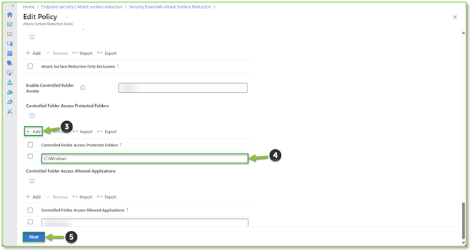 - The default rules will be displayed. Locate the Controlled Folder Access Protected Folders option, select the Add button below the previously listed header. A text box will be generated where you can specify the necessary folder path, files in the provided folder will no longer be able to be modified or deleted by untrusted applications. Select Next to continue.