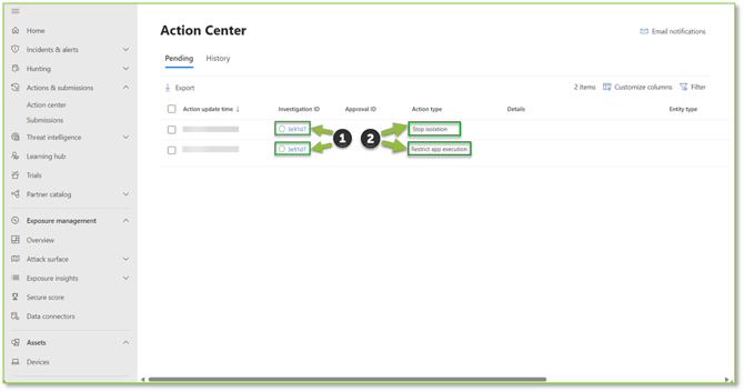 - From the Action Center – Microsoft Defender queue, locate and select any investigation ID that is unique in the list. Note that while there can be multiple entries related to a single investigation ID, each entry can be resolved by clicking into any one of the same linked investigation ID’s. For device related action center items, verify that the Action Type are either Isolate device, Collect investigation package, Restrict app execution, etc.