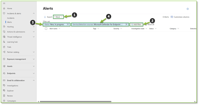 - Navigate to the Alerts – Microsoft Defender Verify that the Date dropdown is set to 1 week, then locate and select the Add filter button. From the Add Filter dropdown, locate and select the Service/Detection Sources. Set the Status filter to New, In Progress and the Service/Detection Sources to Microsoft Defender for Endpoint.