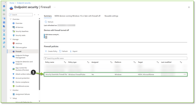 - Navigate to the Firewall – Intune portal, locate and select the Security Essentials Firewall Rules policy or an equivalent Firewall Rules policy.