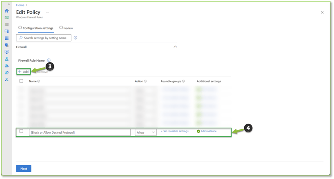- Find the Firewall Rule Name section and select the Add button, an entry should be generated in the list below. Provide the generated entry with a Name (this should indicate the traffic handling state and the associated protocol) and the Action that will be carried out when the Firewall encounters this type of network traffic (either block or allow). Select the Edit Instance button to configure the granularity of the firewall rule.