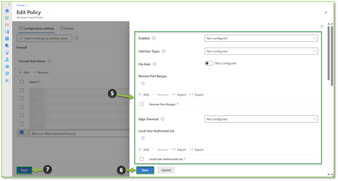 - A pop-out will be generated, here you will be able to define the granularity of the firewall rule. Configure the firewall rule according to your desired requirements for network traffic handling. Once specified, select Save to finalize the rule construction, followed by selecting Next to proceed to the review section.