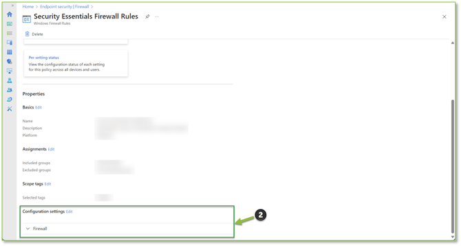 - Navigate to the Firewall – Intune portal, locate and select the Security Essentials Firewall Rules policy or an equivalent Firewall Rules policy.