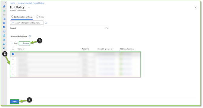 - Find the Firewall Rule Name section, locate and select the desired firewall rule that no longer needs to be influencing network traffic handling. Select the Remove button after the entry has been selected (indicated by a blue checkmark). After the Remove action has been carried out, the entry should no longer be present in the list below. Selecting Next to proceed to the review section.