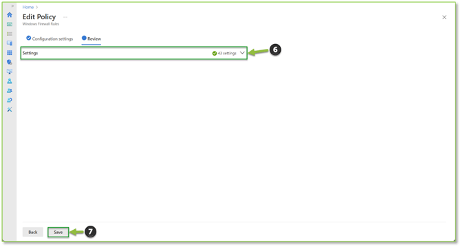 - From the Review section, you will be able to select the Settings dropdown to verify that the removed firewall rule is no longer present. Select Save to finalize the firewall rule removal. Rule changes propagate at the next device check-in, usually within 1-2 hours.