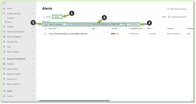 - Navigate to the Alerts – Microsoft Defender portal. Verify that the Date dropdown is set to 1 week, then locate and select the Add filter button. From the Add Filter dropdown, locate and select the Service/Detection Sources. Set the Status filter to New, In Progress and the Service/Detection Sources to Microsoft Defender for Office 365.