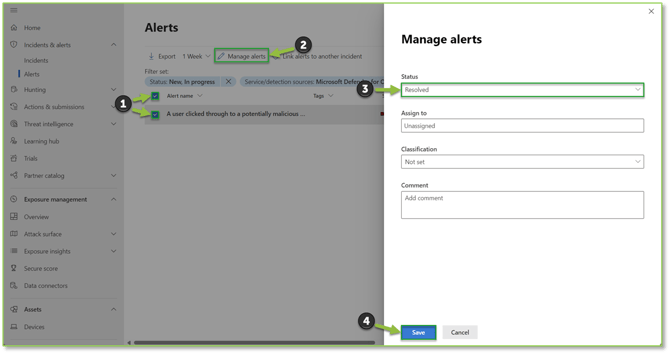 - Select the top-left checkbox to select all alerts or select the checkbox next to the desired alerts you have resolved, followed by selecting Manage Alerts. Under the status dropdown select the Resolved action. Select Save to finalize the resolved action for the desired alerts.
