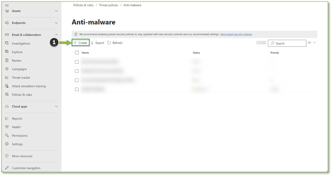 - Navigate to the Anti-Malware – Microsoft Defender portal, locate and select the Create action.