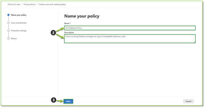 - You will supply basic identification information such as the Name and Description for the policy. Select Next to proceed.