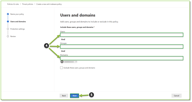 - You will be able to configure Internal Users, Groups, or Domains Assignments or Exclusions for the policy, this section will outline the selected groups that will be in scope to have the email security deployed. Select Next to proceed.