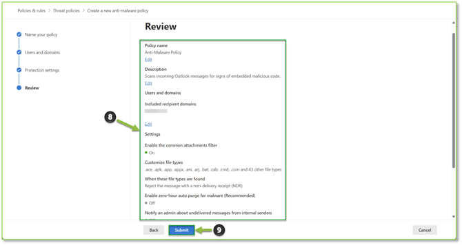 - The review page will allow you to see all configured settings for the policy, if you detect a discrepancy at this stage make note of the section and select Back to go to the previous sections to make the necessary alterations before finalization. If everything checks out, select Submit to publish the threat policy.