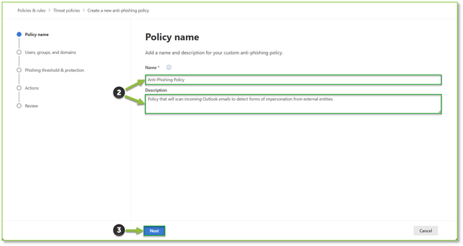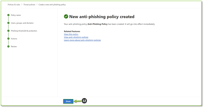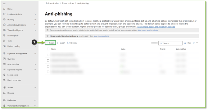 - Navigate to the Anti-Phishing – Microsoft Defender portal, locate and select the Create action.