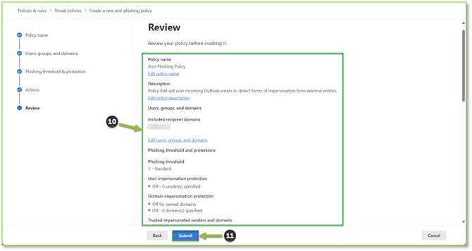 - The review page will allow you to see all configured settings for the policy, if you detect a discrepancy at this stage make note of the section and select Back to go to the previous sections to make the necessary alterations before finalization. If everything checks out, select Submit to publish the threat policy.