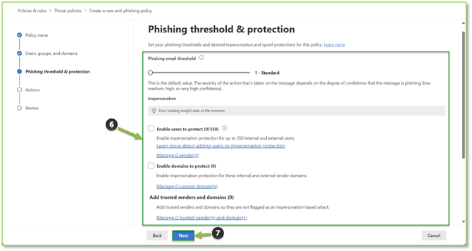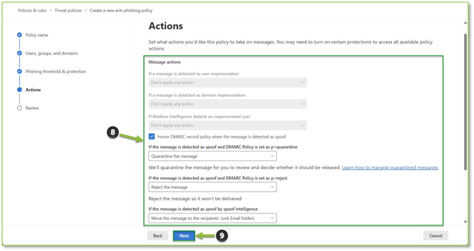- You will need to specify the actions that will be taken on the messages that are flagged for phishing, the actions can be adjusted to take no action, redirect the message, direct the message to junk folder, quarantine, etc. Select Next to proceed to revisions.