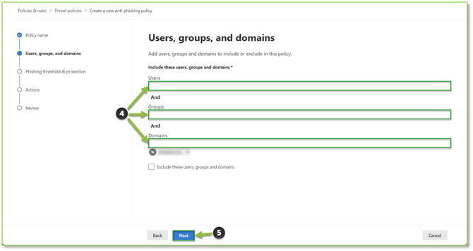 - You will be able to configure Internal Users, Groups, or Domains Assignments or Exclusions for the policy, this section will outline the selected groups that will be in scope to have the email security deployed. Select Next to proceed.