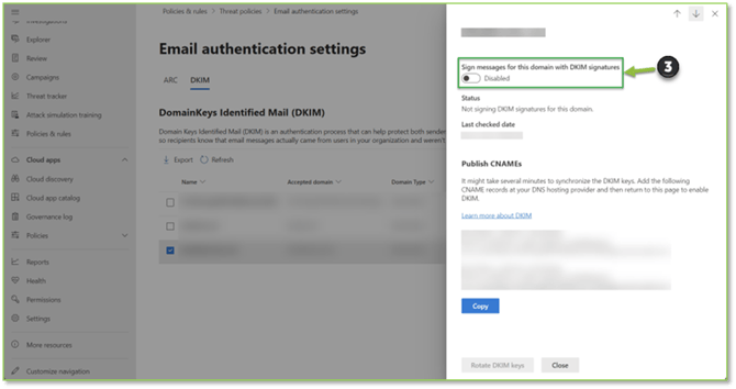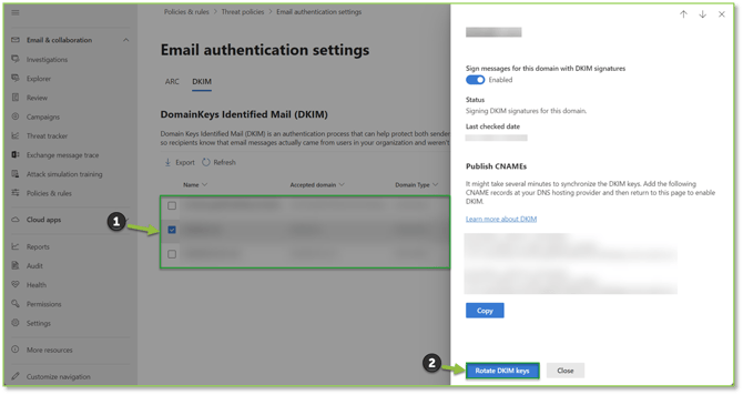 - Navigate to the DKIM Email Authentication – Microsoft Defender portal, locate and select the domain you wish to modify the current DKIM records for. From the generated flyout locate and select the Rotate DKIM keys action, this will require that you Copy the newly generated CNAME records to DNS. Copy these records, perform the DNS addition and publication as your DNS provider recommends.
