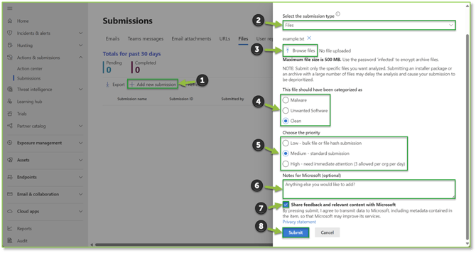 - Navigate to the File Submissions – Microsoft Defender portal, locate and select the + Add new submission action, a flyout will be generated, specify Files from Select the submission type dropdown. You will be able to supply the desired file that keeps getting quarantined from the Browse files action, make sure to select the file from the proper file directory within the generated file explorer window. We will also want to make sure to have the Clean option selected under the This file should have been categorized as prompt. Specify a desired priority for the Choose the priority prompt. Add any optional notes for Microsoft to interpret when processing your submission. The Share feedback and relevant content with Microsoft checkbox must be selected for the File submission action to be initiated. Select Submit to finalize.