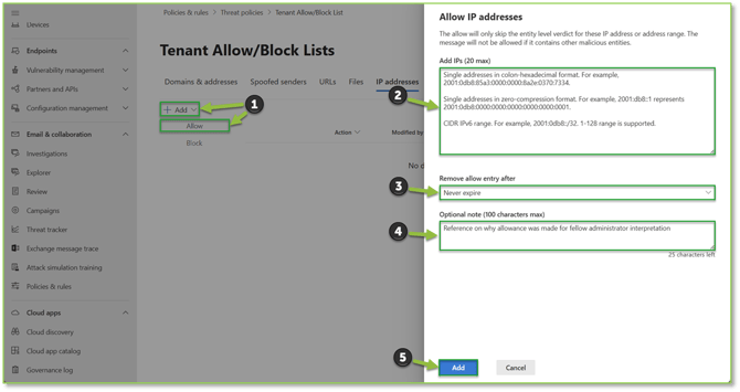- Navigate to the IP Addresses – Microsoft Defender portal, locate and select the Add action followed by Allow. A pop-up will be displayed where you will specify the IPv6 Addresses within the Add IPs field. Specify the timeframe as Never Expire from the Remove block entry after dropdown. Lastly provide a reference point for fellow administration on why the allowance has been instated under the Optional note field. Select Add to finalize the allowance creation.