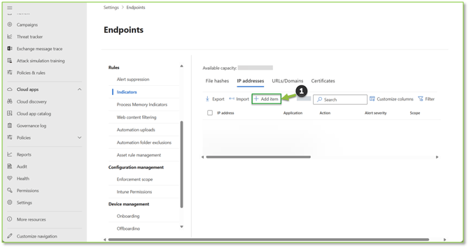 - Navigate to the IP Addresses – Microsoft Defender portal, locate and select the Add Item action.