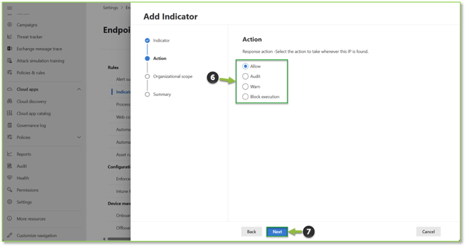 - For the response action, select Allow this will allow connections to the associated IP Address to be made with devices. Select Next to continue.