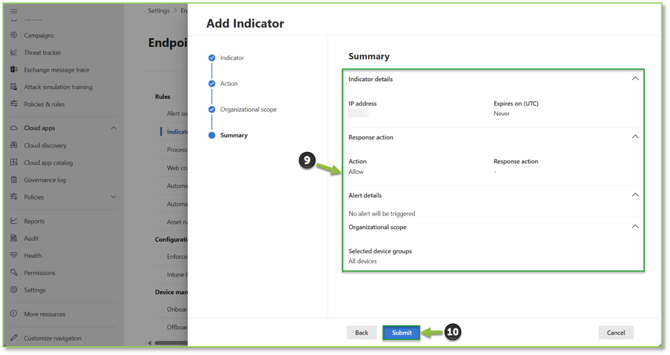 - The summary page will allow you to see all configured settings for the indicator, if you detect a discrepancy at this stage make note of the section and select Back to go to the previous sections to make the necessary alterations before finalization. If everything checks out, select Submit to publish the indicator.