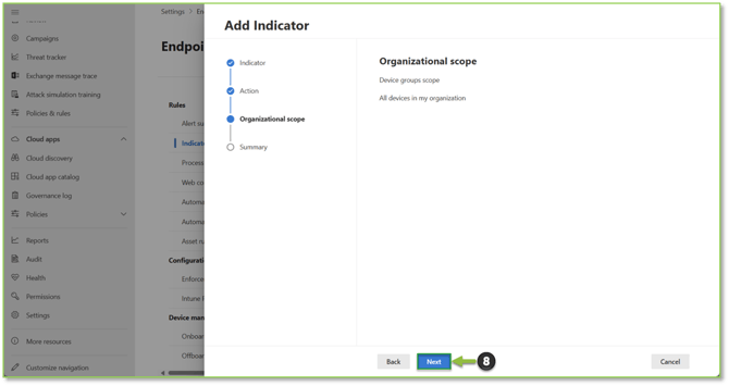 - The default for the organizational scope is set to all MDE joined devices, select Next to continue.