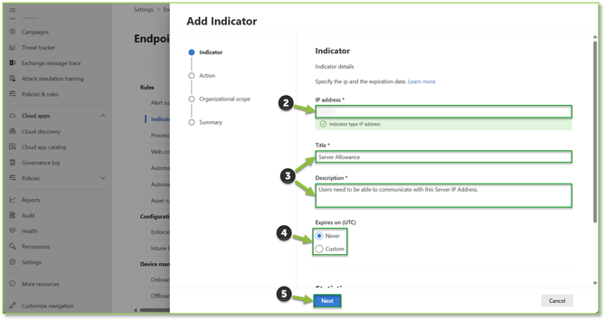- A pop-up will be generated supply the desired IP Address into the input box. You will also need to provide basic information associated with the entry such as Title and Description, with the intent of giving future context if the rule is to be reviewed later. From this page you will either keep the default allow time frame of Never or specify a Custom time frame. Select Next to continue.