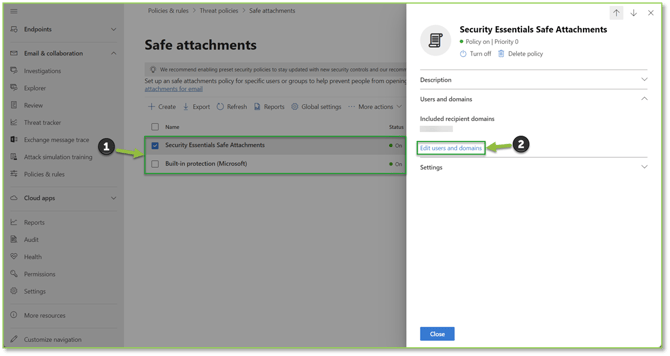 - Navigate to the Safe Attachments – Microsoft Defender portal, locate and select the Security Essentials Safe Attachments policy or the Equivalent Existing Custom Safe Attachments Threat Policy. A flyout will be displayed showing all applicable security settings, locate the Users and domains section and select the Edit action to begin the exception process.