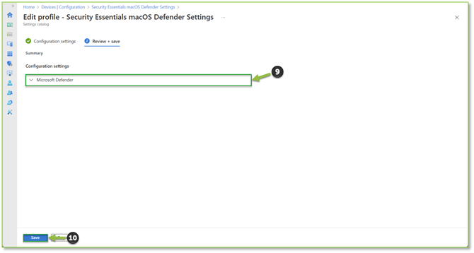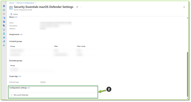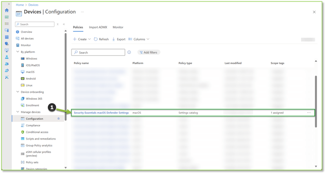 - Navigate to the Configuration Profiles - Intune portal. Select the Security Essentials macOS Defender Settings configuration profile or an equivalent macOS Antivirus configuration profile.