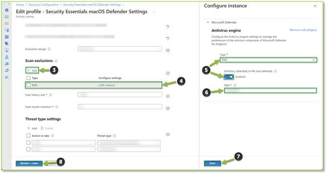 - Find the Scan Exclusions section and select the Add button, an entry should be generated below. Select the Edit Instance button to configure the item to be a path or directory exclusion. A pop-out will be generated, specify the Type as Path from the dropdown, make sure to also configure the radio selection below based on the desired Path you want to create the exclusion for. Supply the desired Path in the provided text field (the Path structure will vary depending on the previously specified radio selection above). It is recommended that these are not commonly used locations – such as the Downloads or Documents folder – but instead locations used by approved custom applications. Along with this, it is highly discouraged to create a path that users are aware bypasses antivirus scanning. Paths included here should not be known to the user and used for application functionality only, lest the user place a downloaded file in this known bypassed location and introduce risk to the system. Select Save to finalize the File Extension exclusion addition, followed by selecting Review + save to proceed to the review section.