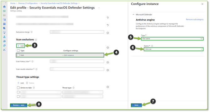 - Find the Scan Exclusions section and select the Add button, an entry should be generated below. Select the Edit Instance button to configure the item to be a process exclusion. A pop-out will be generated, specify the Type as File Name from the dropdown, supply the desired File Name associated with the desired process in the provided text field (specified either by the full path or file name). It is recommended that these are not commonly used processes or processes which could be used to spawn in malware. Select Save to finalize the File Extension exclusion addition, followed by selecting Review + save to proceed to the review section.
