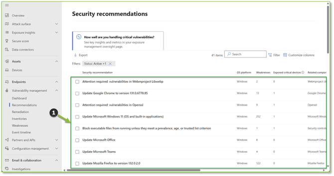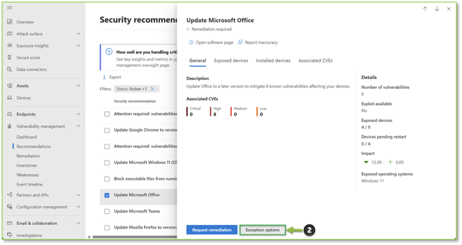 - Navigate to the Recommendations – Microsoft Defender portal, this page shows all the recommendations for devices, including both configuration and software recommendations. Locate the recommendation you wish to accept the risk for.