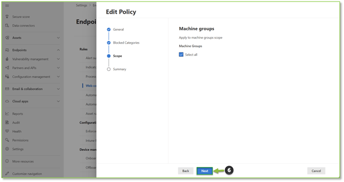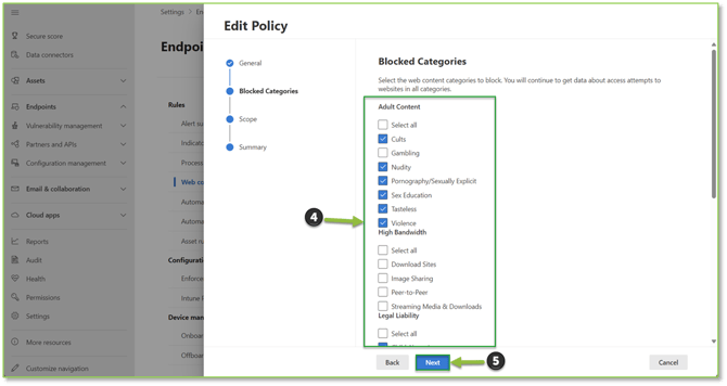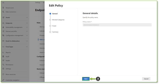 - Upon opening the policy, all the information of the policy will be displayed. From the General section we will want to select Next to continue to the Blocked Categories section.