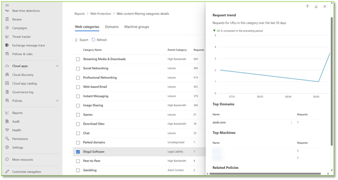 - When you click into a category type, information related to traffic activity, the specific domain trying to be connected to, as well as the machines trying to access the resource will be displayed. Depending on the circumstance remediation steps will vary.
