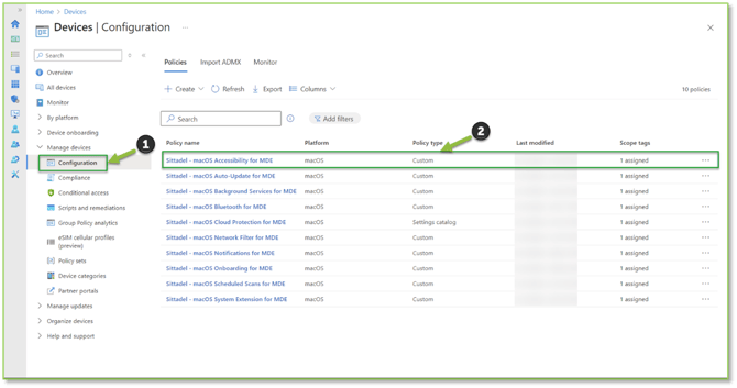 - Navigate to the Device Configuration – Intune portal, here we will find a list of all of the macOS configuration profiles that allow MDE security controls to be enabled without user interaction. Locate and select the Sittadel – macOS Accessibility for MDE profile, this will be leveraged for this example but make sure to fulfill the steps for all the configuration profiles listed.