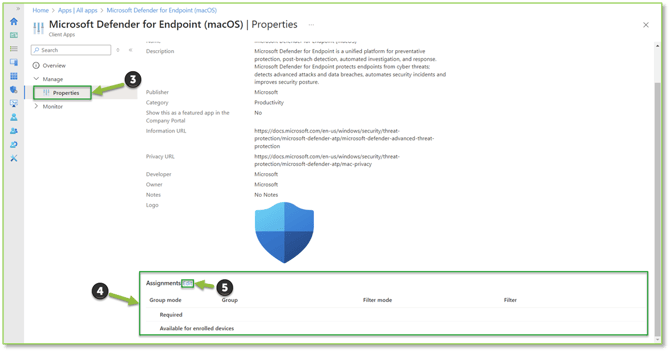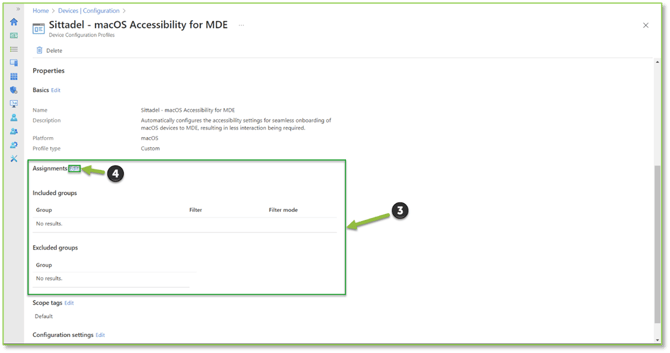 A guide on assigning groups to Intune policies related to macOS Intune MDE onboarding, ensuring necessary security functionality for the MDE Agent are distributed to desired device groups.