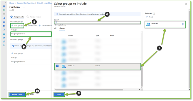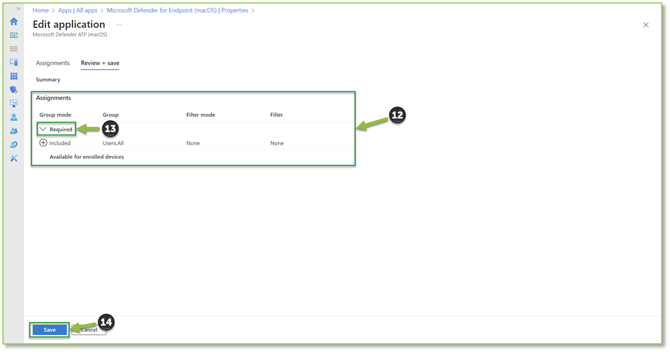 - From the Review + save section, we will want to verify from the Assignments subsection that the previous assignment(s) have been made correctly by selecting the Required dropdown. If the desired group(s) is generating, we will select Save to finalize the macOS Policy assignment process.