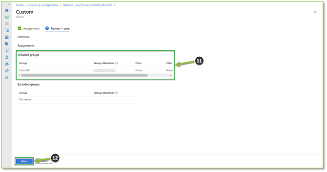- From the Review + save section, we will want to verify from the Assignments subsection that the previous assignment(s) have been made correctly. If the desired group(s) is generating, we will select Save to proceed to making the same assignments on the rest of the MDE configuration profiles.